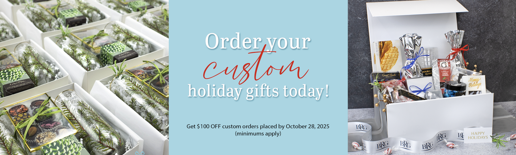 Delicious, gourmet food and treat baskets tailored to your company look and style. Complete with branded ribbons, cards, tags and more!